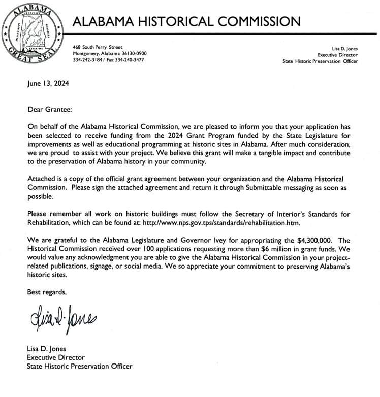 The Committee received a letter from The Alabama Historical Commission in November,2022 informing us that we were awarded a grant in the amount of $37,500.00 to assist with our project.